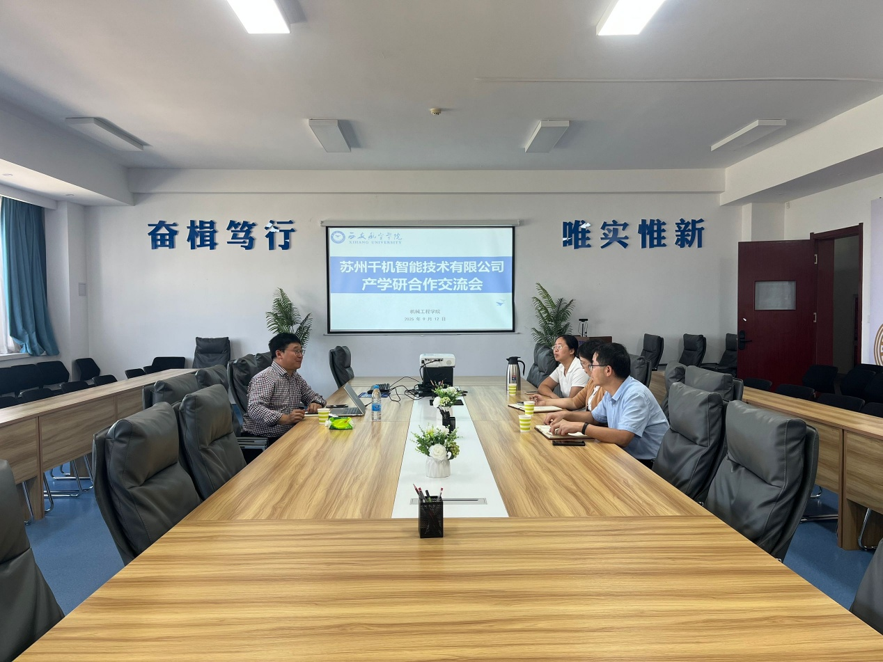 党总支书记孙茉莉、副院长杨武成、科研骨干教师龚春园等与苏州千机智能技术有限公司王振江总监在学院会议室开展了产学研合作交流。王振江也是学院1995届优秀校友,他回顾了在校经历,愿积极推动企业与母校的合作,建议将千机公司的智能制造软件平台引入学院实验室,为学生提供软件操作实践与项目实战机会,也邀请学院教师积极参与企业技术研发,共同优化软件平台功能,实现科研成果转化与教学资源共建共享。