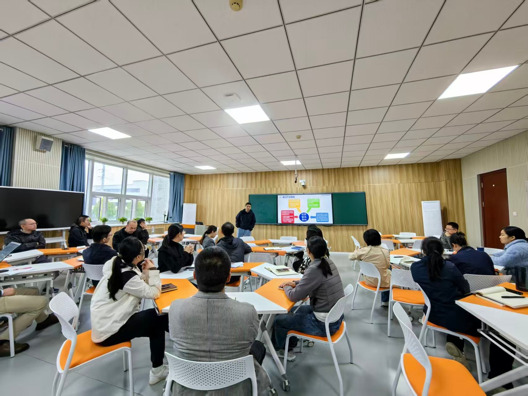 在培训环节,王鹏围绕OBE理念的核心要义、课程目标重构、教学活动设计、学习成果评价以及智慧教室技术工具的应用等方面展开深入讲解。生动阐释了如何基于OBE理念确定课程的核心能力目标,如何利用智慧教室的互动投屏、分组讨论、实时反馈等功能设计沉浸式教学活动,以及如何通过过程性评价与终结性评价相结合的方式,全面监测学生学习成果的达成情况。