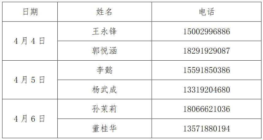 根据《关于学校2024年“清明节”放假安排的通知》文件精神,清明假期为2024年4月4日至2024年4月6日,放假期间,1946伟德国际源自英国值班安排如下: